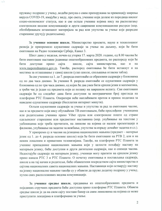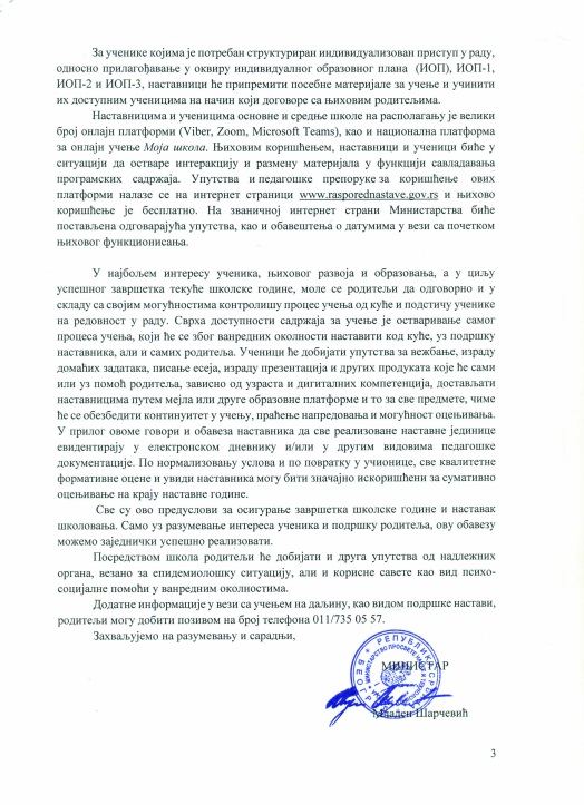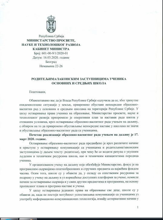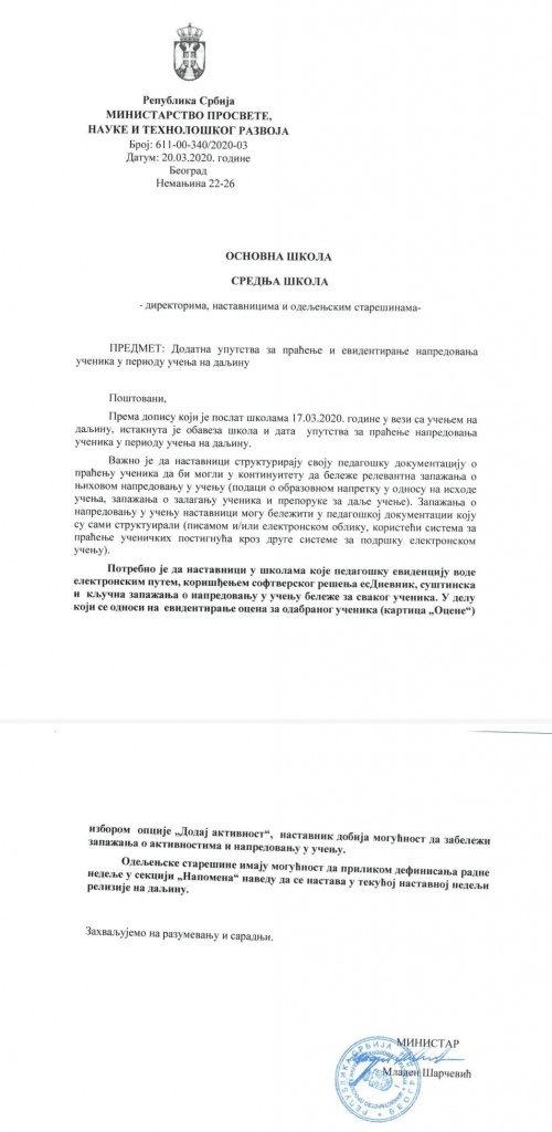 | ПРОЧИТАТИ И ОВA УПУТСТВA У ЦЕЛОСТИ: Настава на даљину у вандредном стању и Додатна упутства школама у вези са планирањем и остваривањем образовно-васпитног рада на даљину, као и Обавештење о измени Правилника о каленадру образовно васпитног рада основне школе за школску 2019/2020. | |