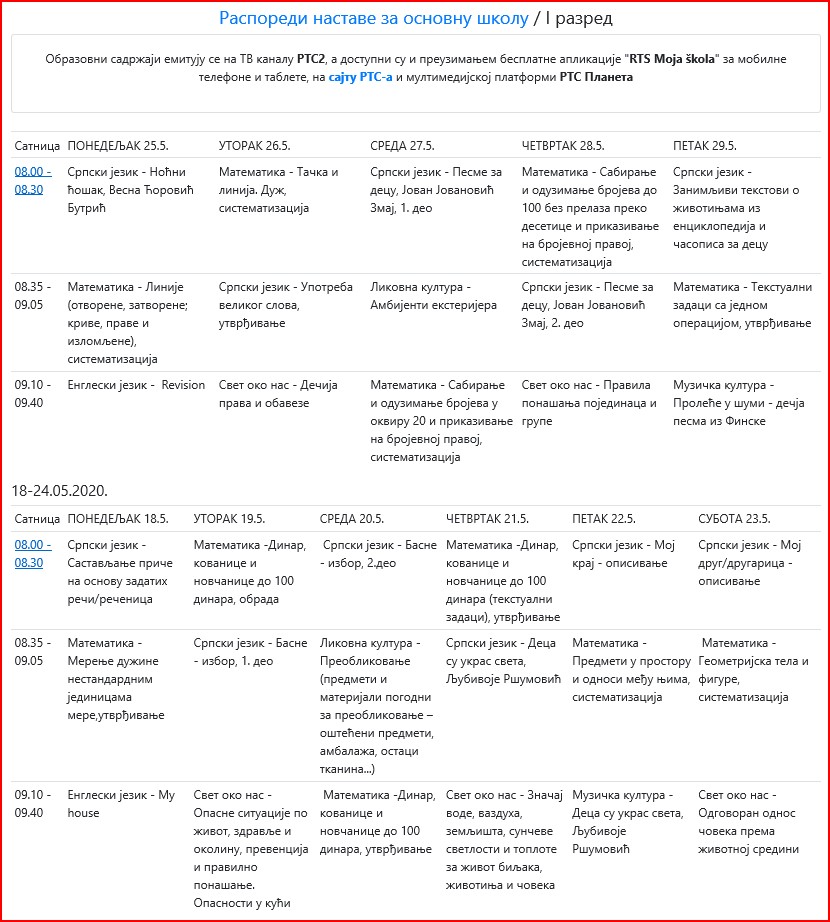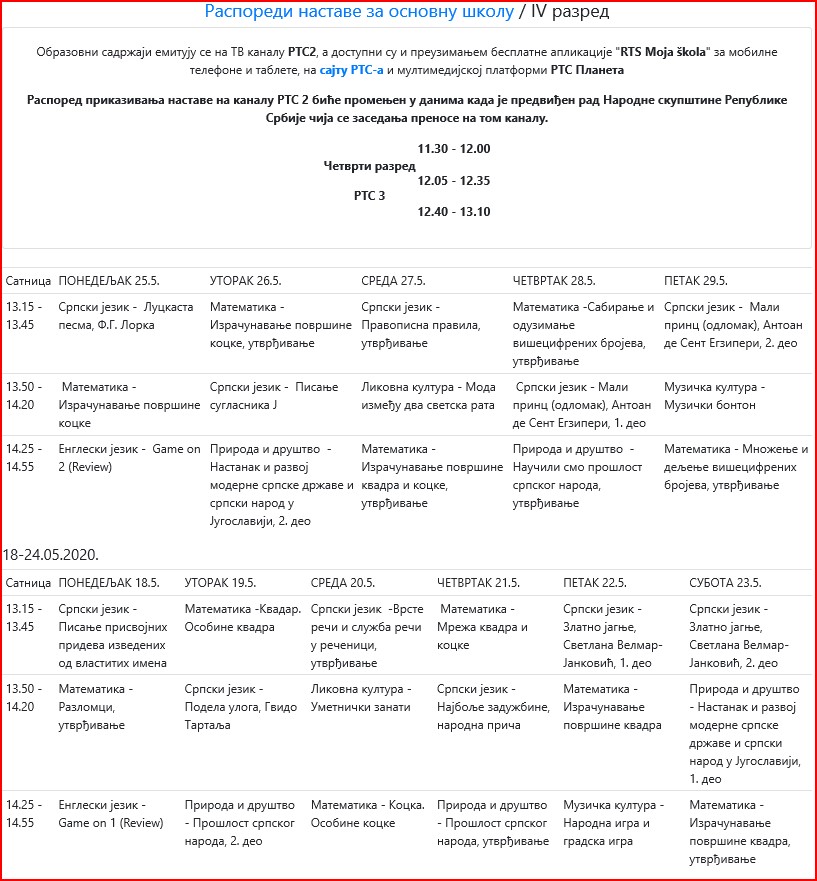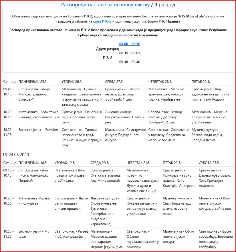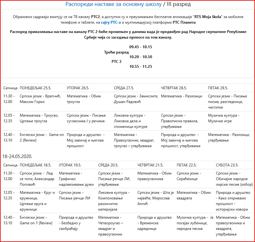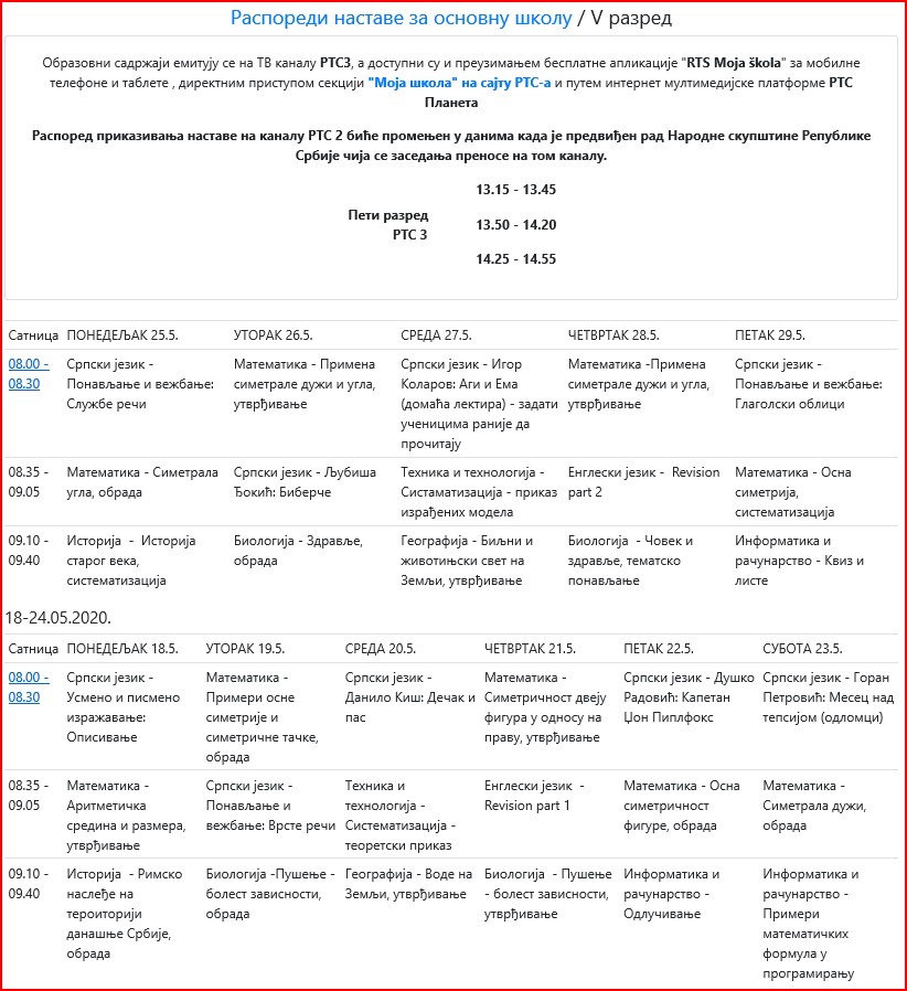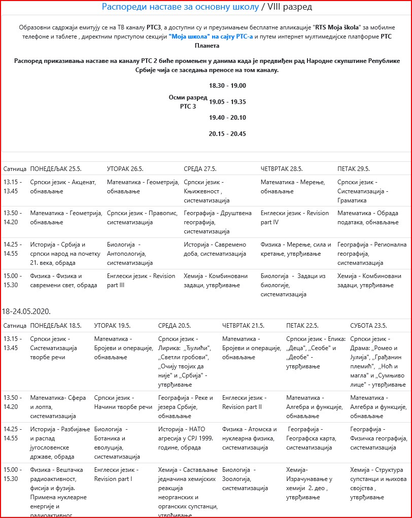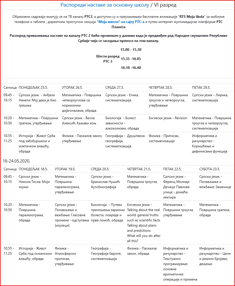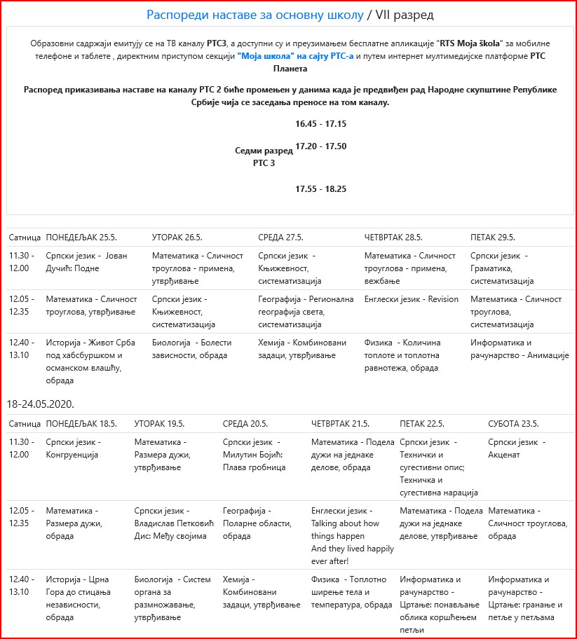 | ОБАВЕШТЕЊА КОЈА СЕ ОДНОСЕ НА ЕМИТОВАЊЕ ЧАСОВА НА РТС КАНАЛ 3 И РТС ПЛАНЕТА, КОЈА СЕ ЗВАНИЧНО ДАЈУ ОД МИНИСТАРСТВА ПРОСВЕТЕ ПОГЛЕДАТИ НА АДРЕСИ: www.rasporednastave.gov.rs | |